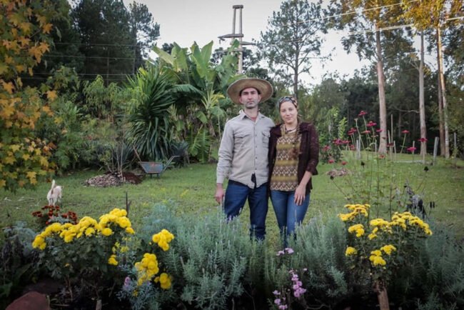 Antonela Muller y Alejandro Germán Borgmann son una pareja de docentes que implementó la agroecología como estilo de vida en la localidad de Capioví. Desde 2017 llevan adelante la Granja “El Zorzal”, donde producen variados alimentos, y elaboran yogurt, vinos, fermentados, cosméticos naturales y tinturas madre, entre otros productos. Ambos son docentes de agronomía, se conocieron mientras estudiaban el Profesorado en Ciencias Agrarias y se capacitaron para desarrollar la actividad de manera responsable.