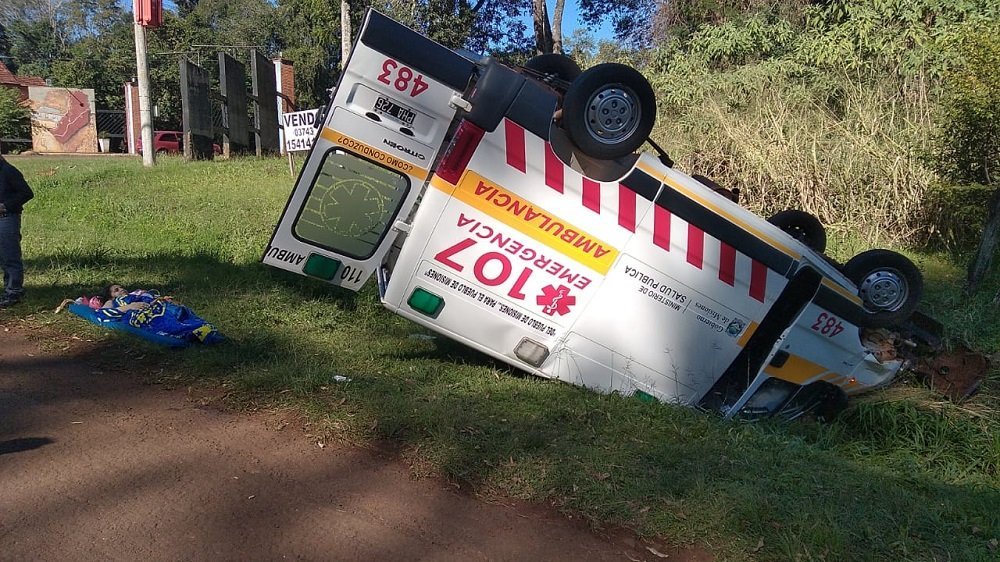 En la tarde de este lunes, una ambulancia del Ministerio de Salud Pública de Misiones y afectada al hospital de Dos de Mayo volcó en el kilómetro 1.501 sobre la ruta nacional 12, a la altura de El Alcázar, con cuatro ocupantes a bordo: el chófer, una enfermera, una paciente y su pareja, estos últimos oriundos de Picada Indumar.