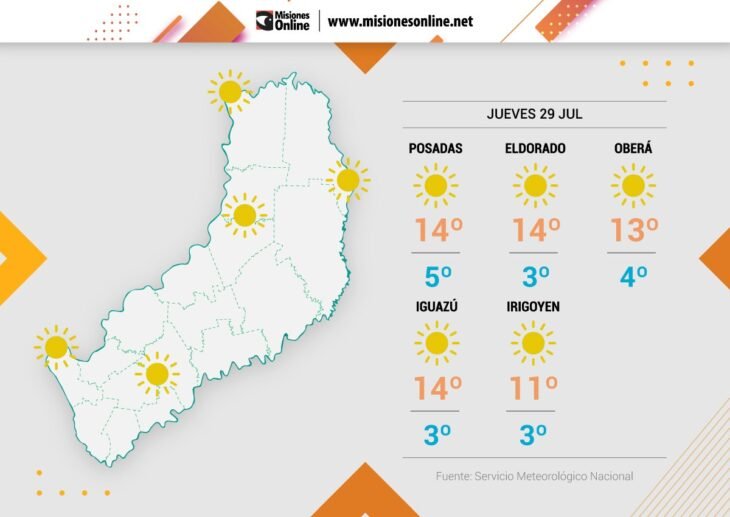 Temperaturas: madrugada aún fría, tarde templada; máxima estimada en 19ºC en Puerto Iguazú con 19°C de sensación térmica, la mínima sería de 5ºC en Apóstoles con 3°C de sensación térmica.