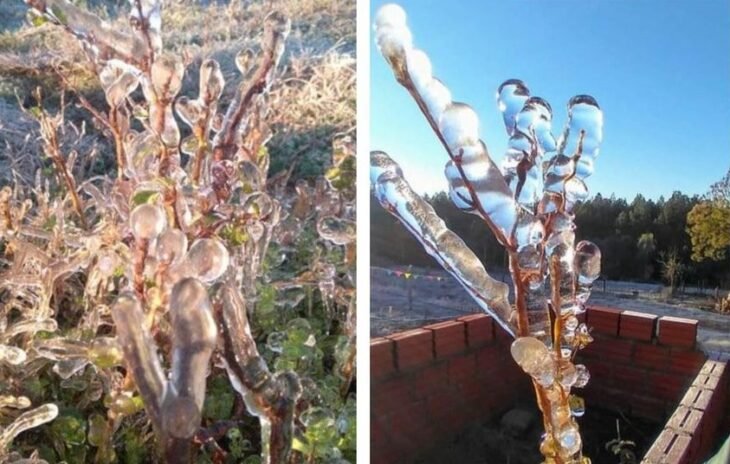 En las fotos se observan ramas de plantas y árboles completamente cubiertas con hielo.