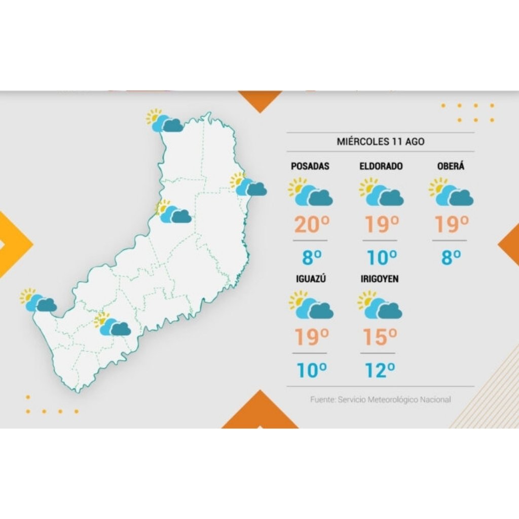 Temperaturas: amanece frío especialmente en el sur, tarde templada; máxima estimada en 21ºC en Posadas con 21°C de sensación térmica; la mínima sería de 7ºC en Apóstoles con 5°C de sensación térmica.