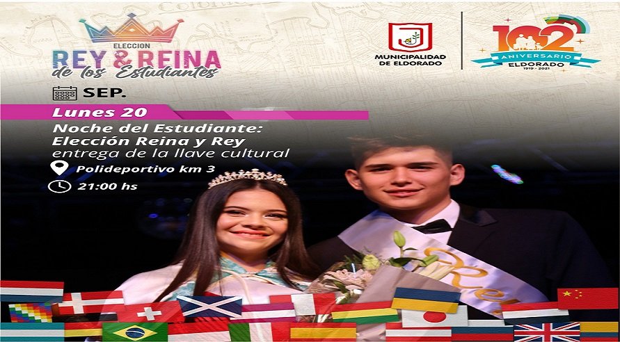 Habrá bandas locales animando la velada, y la noche finalizará con la coronación del rey y la reina de los estudiantes de Eldorado 2021. De esta forma, los jóvenes de nuestra ciudad recibirán su “Día del Estudiante” (21 de septiembre) en el marco de una sana celebración y con la coronación de sus reyes.