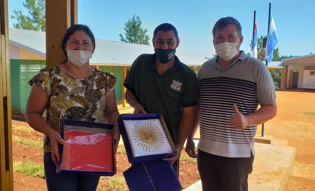 Hoy el Intendente Roberto Carlos Wern , junto a la Diputada Provincial María Cristina Bandera hicieron entrega de un juego de Banderas ceremoniales al Sr. Director del colegio secundario IEA N° 11 de Colonia Delicia y recorrieron el establecimiento , donde se vio el gran empeño que tienen los profesores y alumnos para llevar adelante semejante institución que día a día hace a la formación de cada uno de ellos .