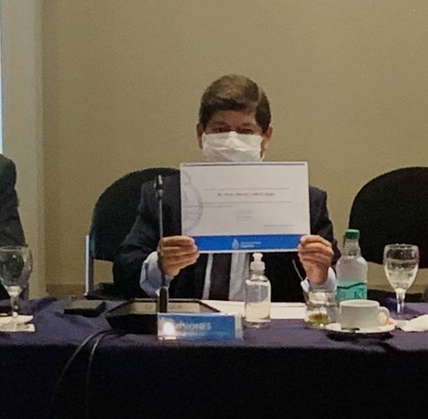 El ministro de Salud Pública de Misiones, Dr. Oscar Alarcón recibió este viernes, en el marco del Consejo Federal de Salud (Cofesa), un reconocimiento en su nombre y de todo el equipo de salud de Misiones por parte de la ,inistra de Salud de la Nación, Dra. Carla Vizzotti, por el compromiso, esfuerzo y dedicación en el trabajo en conjunto en el momento más difícil de la historia sanitaria mundial.
