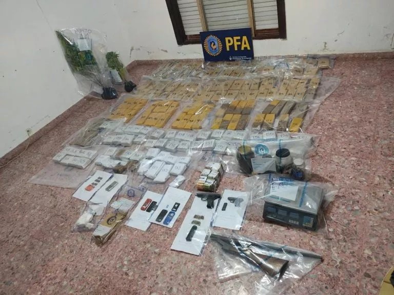 Durante los procedimientos, los efectivos incautaron 392 kilogramos de picadura de marihuana, 918 gramos de clorhidrato de cocaína, 2.053 gramos de pasta base de cocaína, 45 kilogramos de lidocaína utilizada como sustancia de corte y estiramiento para la droga, seis armas de fuego con municiones, dos plantas de cannabis sativa, cuatro automóviles, seis teléfonos celulares, tres balanzas de precisión y 365.100 pesos argentinos.