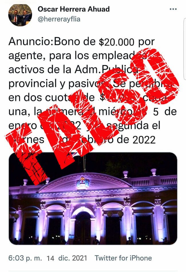 Durante la tarde de este martes circuló en redes y grupos de Whatsapp un supuesto tuit de la cuenta oficial del gobernador de Misiones, Oscar Herrera Ahuad, anunciando un bono de 20 mil pesos para empleados de la administración pública, tanto activos como pasivos. Desde el Gobierno se informó que dicho tuit es falso.