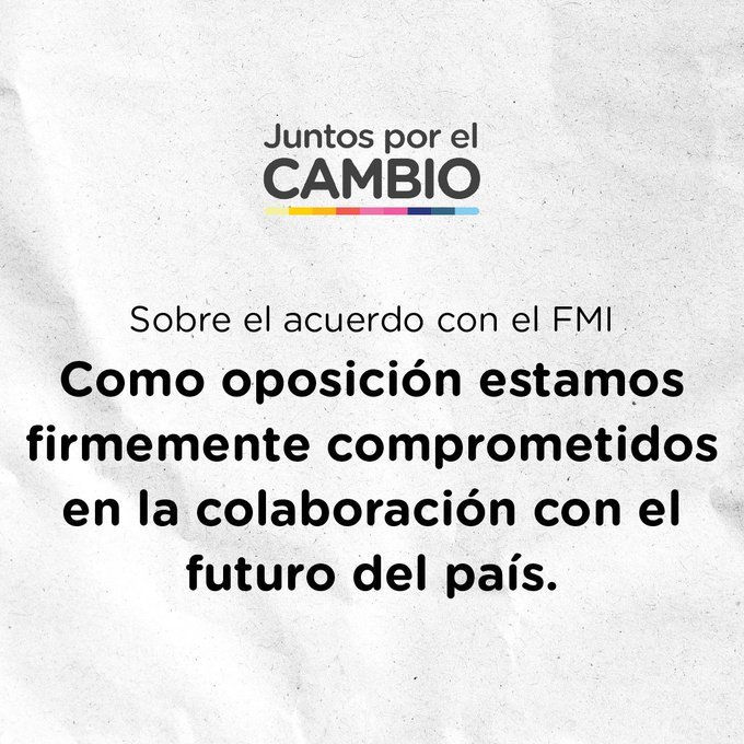 Desde Juntos por el Cambio dejamos en claro nuestro compromiso para colaborar con el País. En tal sentido, aguardaremos que el acuerdo esté plasmado en una carta de intención con el FMI, como dice la ley, sea remitido al Congreso para en ese momento manifestar nuestra posición al respecto.