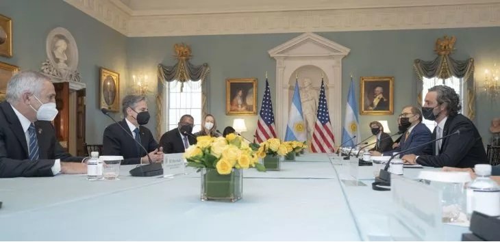 El canciller se reunió con el secretario de Estado, Antony Blinken. También estuvo presente Embajador ante Estados Unidos, Jorge Argüello y su par en Argentina, Marc Stanley. El mitín sucedió en el Salón Thomas Jefferson.