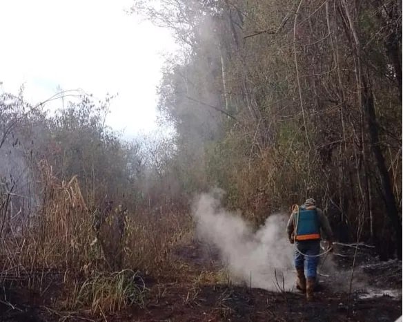 En San Jorge, Tarumá y Caraguatay a pesar de la lluvia se sigue trabajando porque quedaron pequeños focos, troncos que aún tienen fuego y prevén apagar con mochilas fumigadoras.