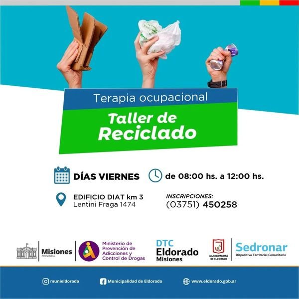 Generan actividad de Terapia ocupacional en el SEDRONAR de Eldorado. Desde el Dispositivo Territorial Comunitario de la ciudad de Eldorado se abrió la inscripción a nuevos talleres. En esta oportunidad se ofrece la oportunidad de capacitarse en RECICLADO y PORCELANA FRÍA. Estos talleres se brindan en las instalaciones del DIAT, calle Lentini Fraga 1474, kilómetro 3.Es una oportunidad de aprender nuevos oficios y que la comunidad tiene las puertas abiertas para realizarlos, sin costo alguno..