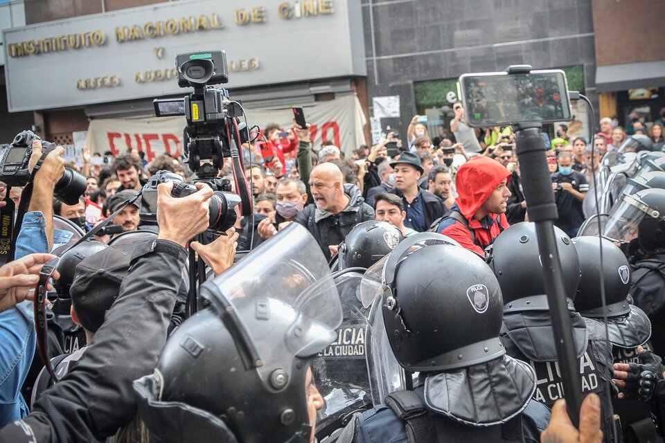 “Hubo represión. Se llevaron detenides a tres compañeres: liberaron a dos y uno quedó todavía. Tenemos el apoyo de abogadas y abogados, está también ATE Nacional y el ministro de Cultura, que se hizo presente en la movilización”, explicó la directora Andrea Testa a Página/12 desde el lugar de los acontecimientos. Según la realizadora, el funcionario consideró la situación del sector como un asunto de urgente resolución. “Algunes representantes de esta movilización nos reunimos con el ministro cuando llegó, porque las puertas del Incaa fueron cerradas en medio de los empujones y los golpes de la Policía. Hubo una decisión de cerrar las puertas y no pudimos ingresar para nuestro resguardo”, agregó.