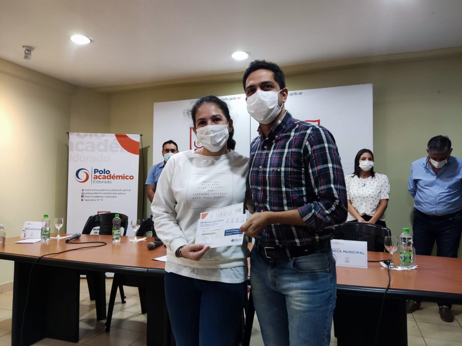 La entrega de becas estuvo encabezada por el secretario de Gobierno de la Municipalidad de Eldorado, Matías Sotelo, el director de Cultura y Educación, José Duarte, el director de Contabilidad General, Francisco Sphars, y la jefa del departamento de Asuntos Estudiantiles, Cintia Talavera.