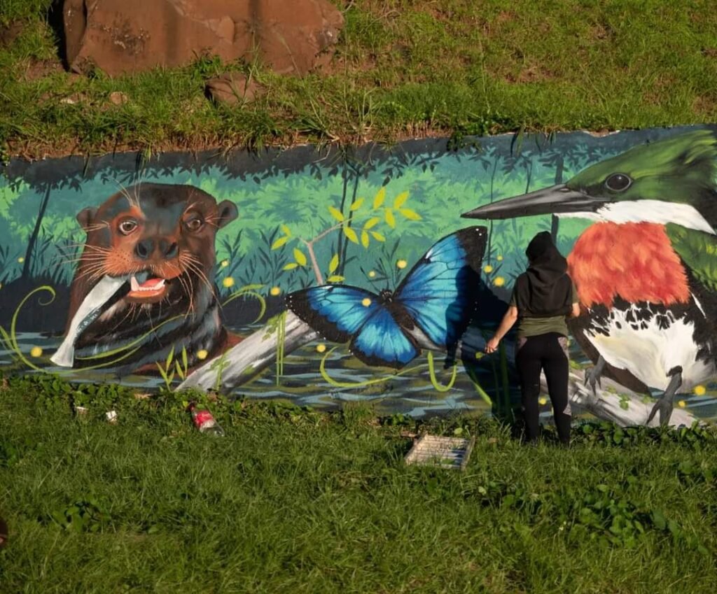 Semanas atrás, iniciaron un mural en el marco del evento “Abrazo al Paraná”, con motivo del día mundial del agua. Ubicado en el puerto de la ciudad de Eldorado, sobre un muro que da hacia el río en la zona de los muelles, el mural representa elementos de la naturaleza propios de nuestra zona y de la vida acuática.
