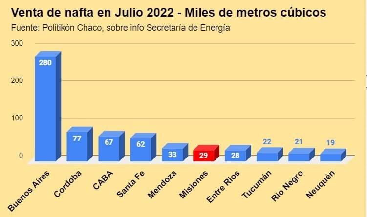 Según datos divulgados por la Secretaría de Energía, Misiones ya ostenta el 6° lugar por volumen de nafta vendida, si se toma el mes de julio 2022. Solamente superada por los seis distritos ricos: Buenos Aires, Córdoba, CABA, Santa Fe y Mendoza (ver cuadro más abajo).