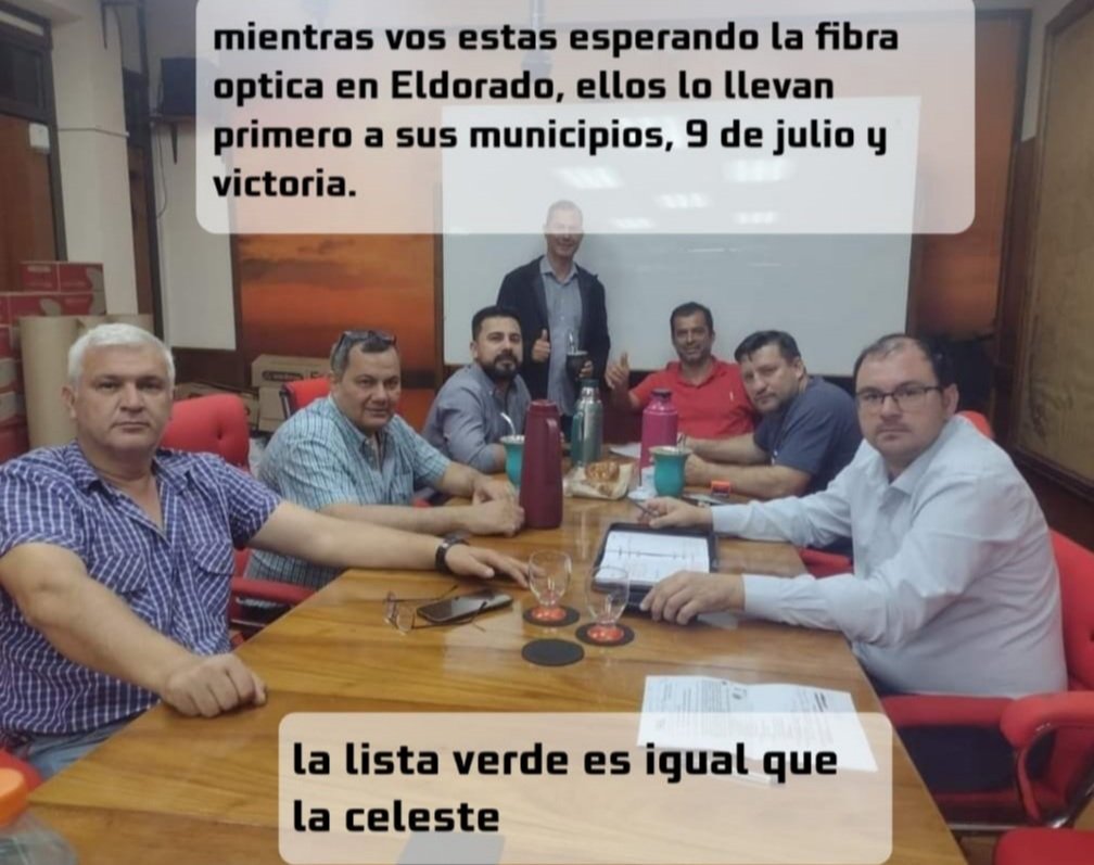 Ayer en una publicación Institucional de la Municipalidad de Colonia Victoria, la cual acompañaron con una foto en donde se puede ver encabezando al Intendente Hugo Andino a la derecha a Ricardo (CHULO ) Velázquez , Otazú y el Comisario Benítez y a su izquierda un vecino de Victoria , Rubén Kobler , Zunskoski , esa foto hace recordar las antiguas con Alberto Romero , lo llevaron al vecino de un Barrio de Colonia Victoria , Parejha el que es lindero con la vecina ciudad de Delicia , con el verso de que les trabaje en estas elecciones venideras y si gana la lista ( verde ) le van a instalar el Internet, o sea le van a llevar desde Colonia Victoria la fibra Óptica.