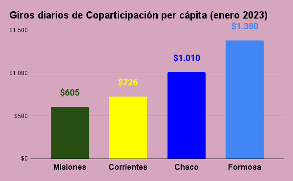 Por su parte, Chaco obtuvo 1010 pesos por cada uno de sus 1.142.963 habitantes; mientras que Formosa recibió 1380 pesos por cada uno de sus 606.041 pobladores.