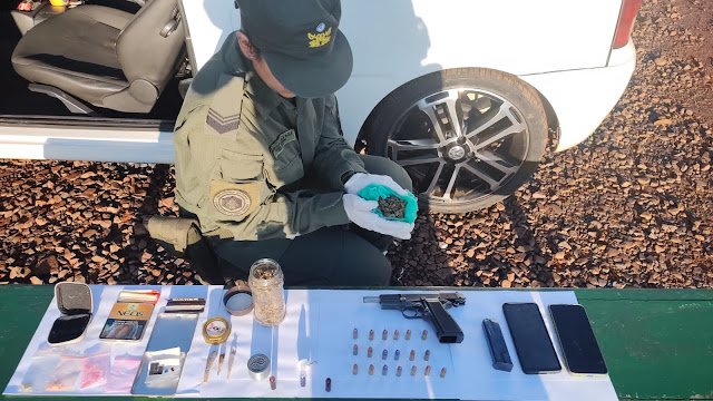 Al requisar el vehículo, los gendarmes hallaron un envoltorio con sustancia blanca, un tubo con marihuana, dos cigarrillos artesanales de la misma droga, dos picadores, un frasco con cogollos, un recipiente con troqueles de LSD, otro con pastillas de éxtasis, una pistola 9 mm con el número de serie suprimido, un cargador y 19 municiones. También se incautó dinero en efectivo.