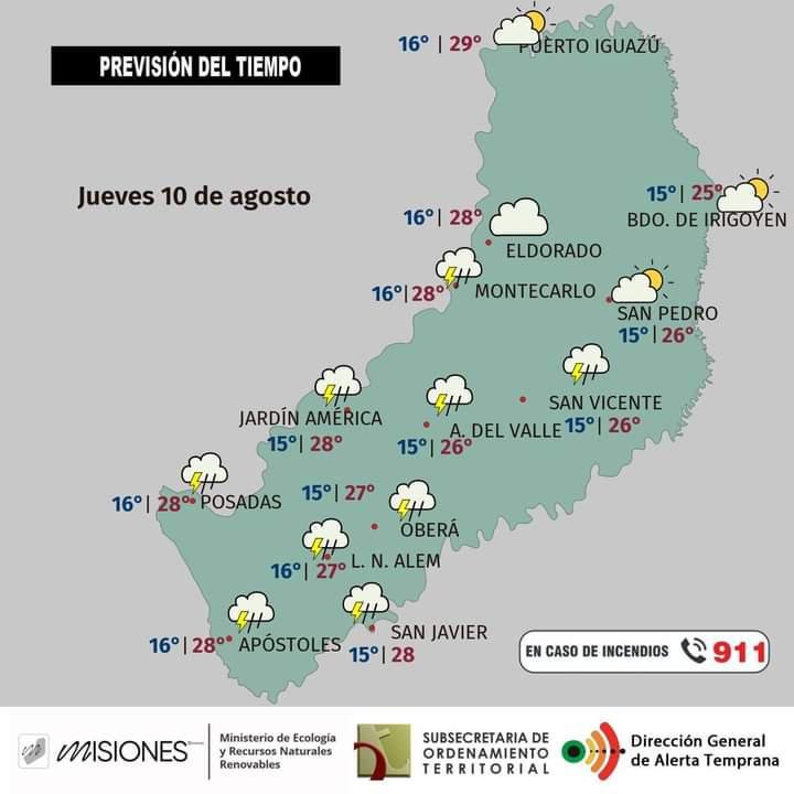 Temperaturas: máxima en la provincia estimada en 21 °C para Puerto Iguazú; la mínima sería de 10 °C a la noche en Apóstoles.