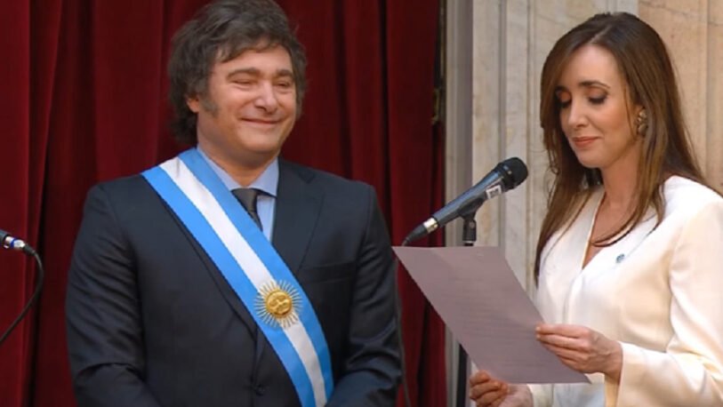 En una breve ceremonia que fue transmitida por cadena nacional, Milei juró como presidente y Victoria Villaruel como vicepresidente.