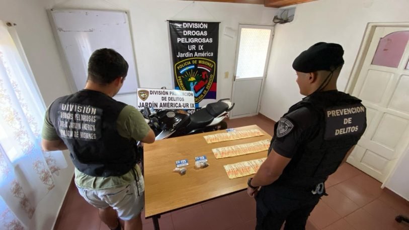 Según refirieron efectivos de la Unidad Regional de Jardín América, una patrulla interceptó esta tarde a un hombre en el playón deportivo del barrio Hermoso, el cual estaría comercializando marihuana. En su poder secuestraron dosis fraccionadas de la droga y más de $300.000 pesos en billetes de distintas denominaciones, además de la motocicleta en la que se desplazaba.