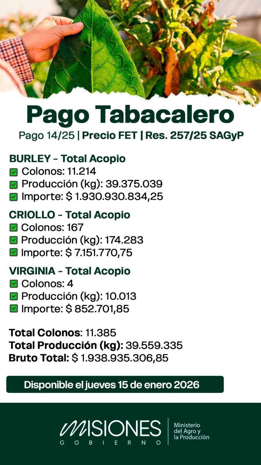El Ministerio del Agro y la Producción confirmó que el próximo 15 de enero se concretará un nuevo desembolso del Fondo Especial del Tabaco (FET) correspondiente al tramo 14/25, por un monto total de $1.938.935.306,85, que alcanzará a 11.385 familias productoras en distintos puntos de la provincia.